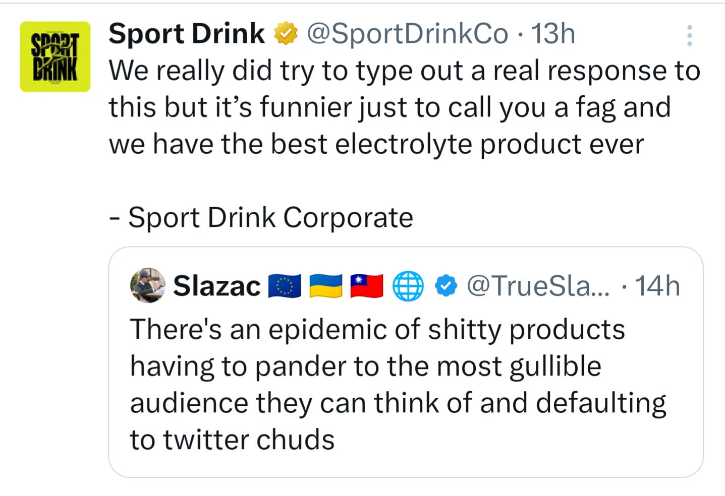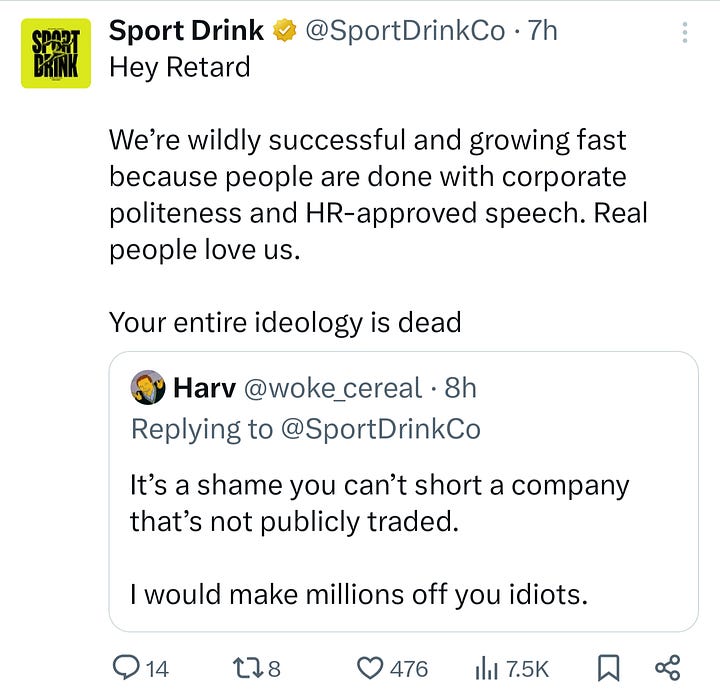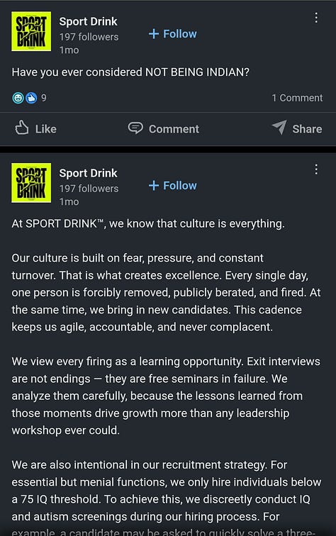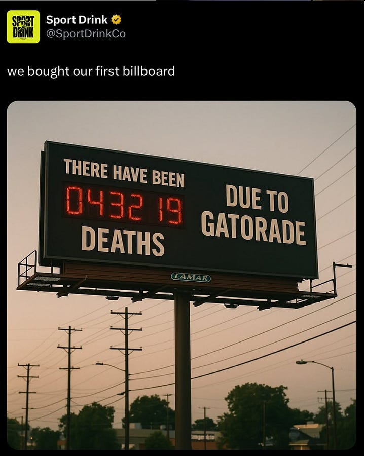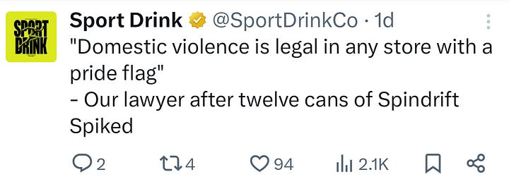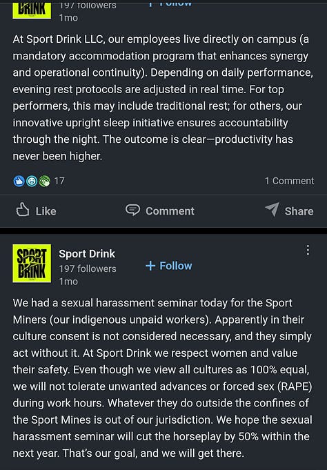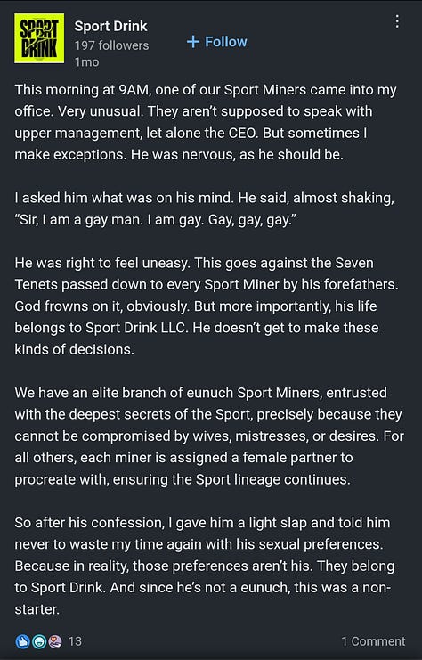 Their Instagram account is tame, nothing particularly objectionable (though, of course, Instagram has much harsher discrimination and harassment policies compared to X). Most of their Instagram posts feature fake feuds with Gatorade and other brands, or content creators reviewing their products, what you would expect from a brand’s social media page. I would describe their aesthetic as “Ayn Rand’s The Fountainhead meets that-one-Apple-commercial-from-the-‘80s-where-that-lady-hurls- a-hammer.” Arguably, there are fascist undertones to many of their posts, but I’ll allow you to judge for yourself. The LinkedIn account associated with Sport Drink Co., however, tells a much different story: